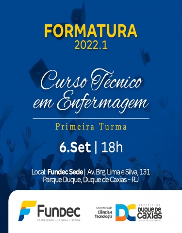 PREFEITURA DE DUQUE DE CAXIAS VAI PROMOVER FORMATURA DA PRIMEIRA TURMA DO CURSO DE TÉCNICO EM ENFERMAGEM Na próxima terça-feira (06), a Prefeitura de Duque de Caxias, por meio da secretaria municipal de ciência e tecnologia, vai realizar a cerimônia de formatura da primeira turma do curso de Técnico em Enfermagem da Fundec.
