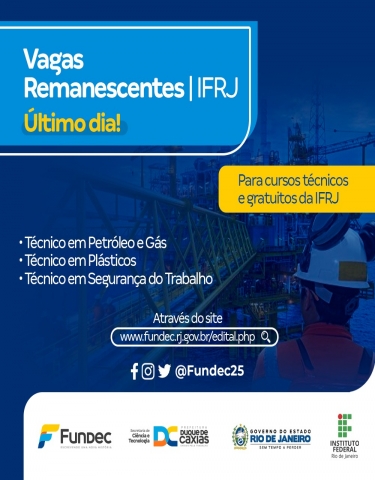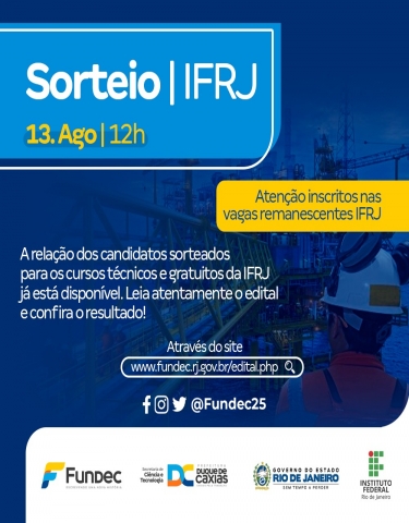 ATENÇÃO ALUNOS SORTEADOS PARA AS VAGAS REMANESCENTES DOS CURSOS TÉCNICOS DA IFRJ O Instituto Federal de Educação Ciência e Tecnologia do Rio de Janeiro (IFRJ), em parceria com a Fundec, deu início ao período de entrega da documentação e confirmação de matrícula para os estudantes sorteados nos cursos técnicos gratuitos. Será possível realizar a conclusão do cadastro de 15 a 18 de agosto.