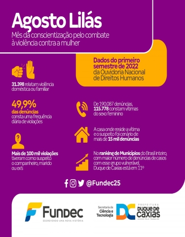 AGOSTO LILÁS | MÊS DE CONSCIENTIZAÇÃO PELO COMBATE À VIOLÊNCIA CONTRA A MULHERA campanha Agosto Lilás foi estabelecida em razão da Lei Maria da Penha, que completou 16 anos no último domingo (7), como um meio de alertar a população e incentivar as denúncias.